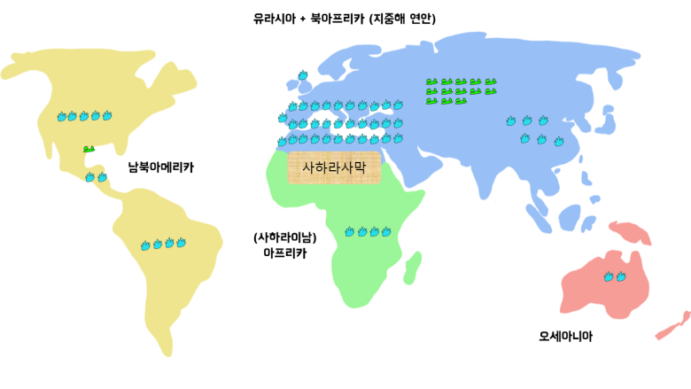 3. 식량 생산에서 후덜덜한 것은 작물화시켜 주식으로 삼을만한, 세계를 통틀어 56종 밖에 안 되는 후보군 중 무려 39종이 유라시아 대륙에 있었다. 그중에서도 32종이 지중해 연안에 있었다. (아프리카에서도 사하라 사막 북부는 지중해 연안으로 로마부터 시작해서 유럽 역사와 함께 움직인다.)